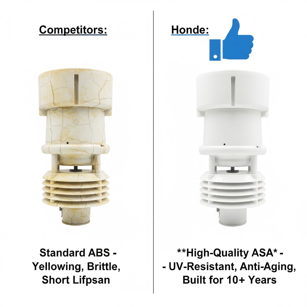 V terénu záleží na materiálech. Většina levných meteorologických stanic používá standardní ABS plast, který může po delším vystavení slunci zežloutnout a zkřehnout.